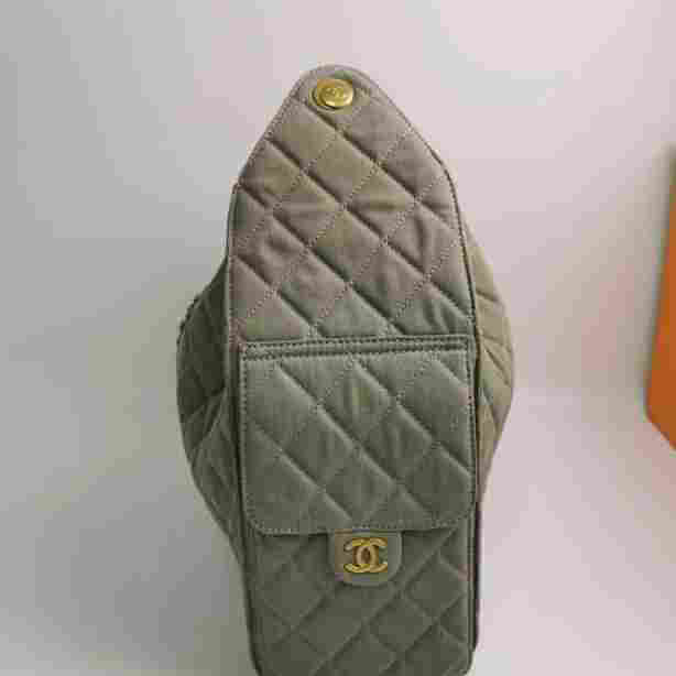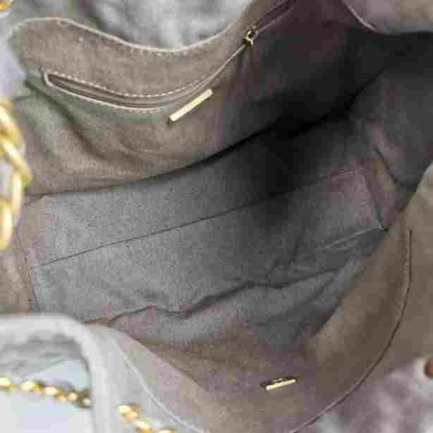 Crafted from diamond-stitched suede, it includes a leather-threaded gold chain strap and side pockets accented with the CC logo. The compact size makes it practical while maintaining a clean, structured look.