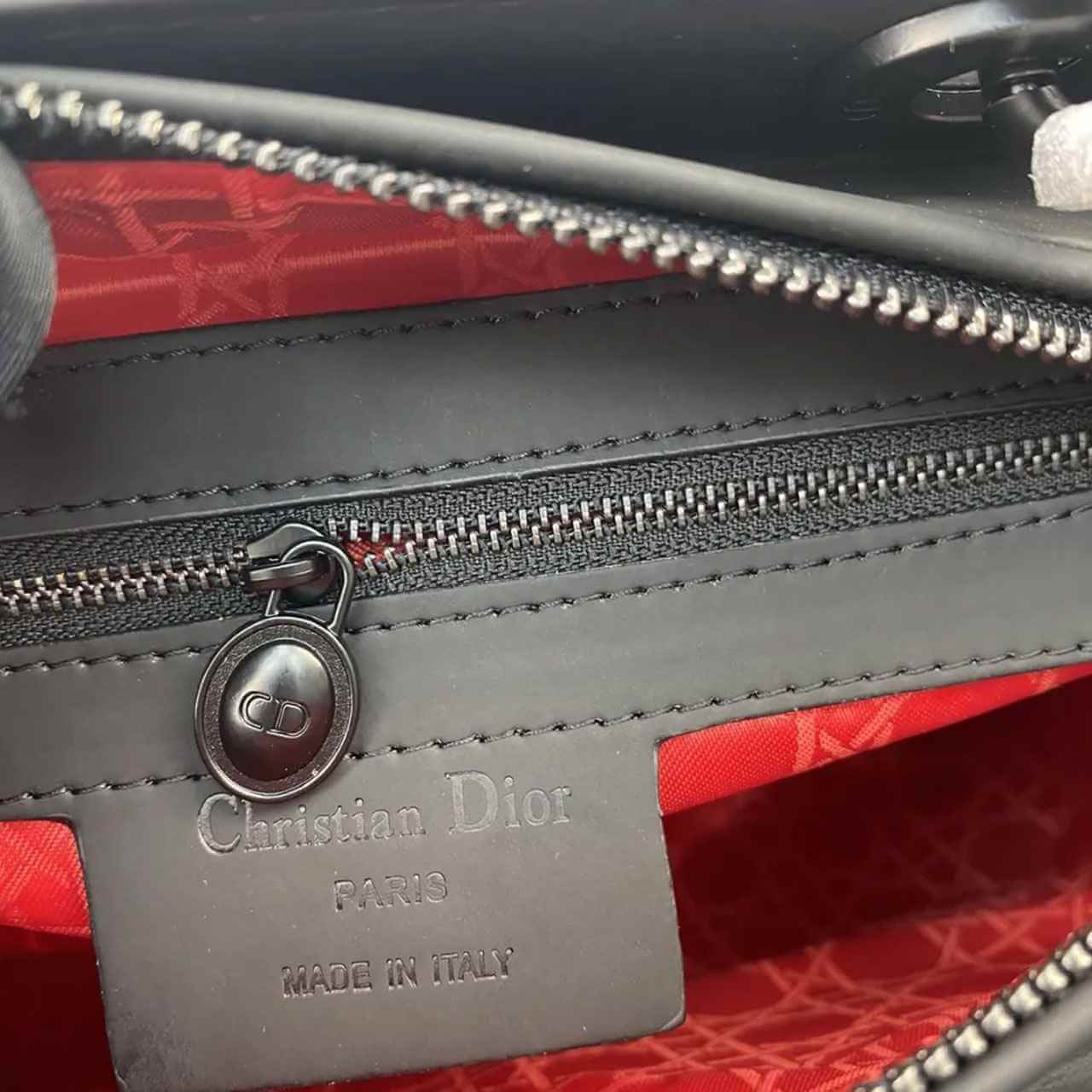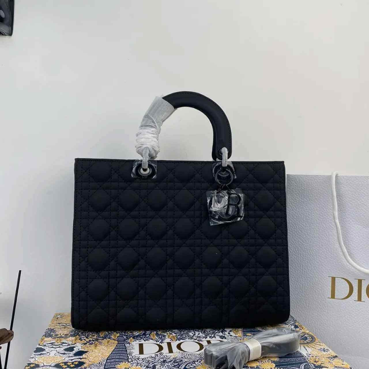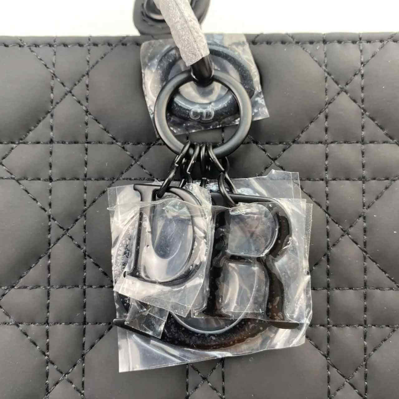 The Dior Large Lady Dior Bag 32cm in Ultramatte Black is a structured and spacious handbag designed for everyday use. Crafted from ultramatte Cannage calfskin, it features matching matte black D.I.O.R. charms for a clean and modern look.