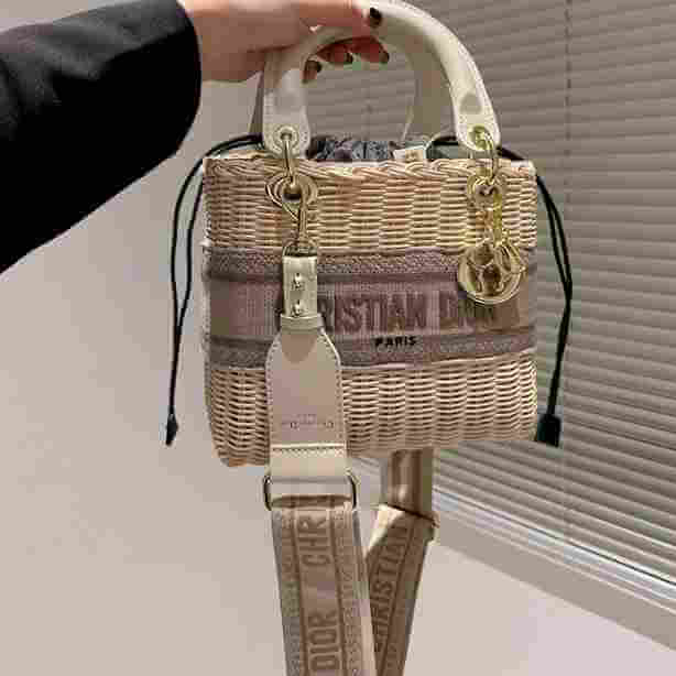 The structured wicker exterior gives the bag a refined yet relaxed feel, making it perfect for warm-weather outfits and everyday wear. Inside, the bag features a Latte Dior Oblique jacquard pouch, adding a signature Dior touch to the design.