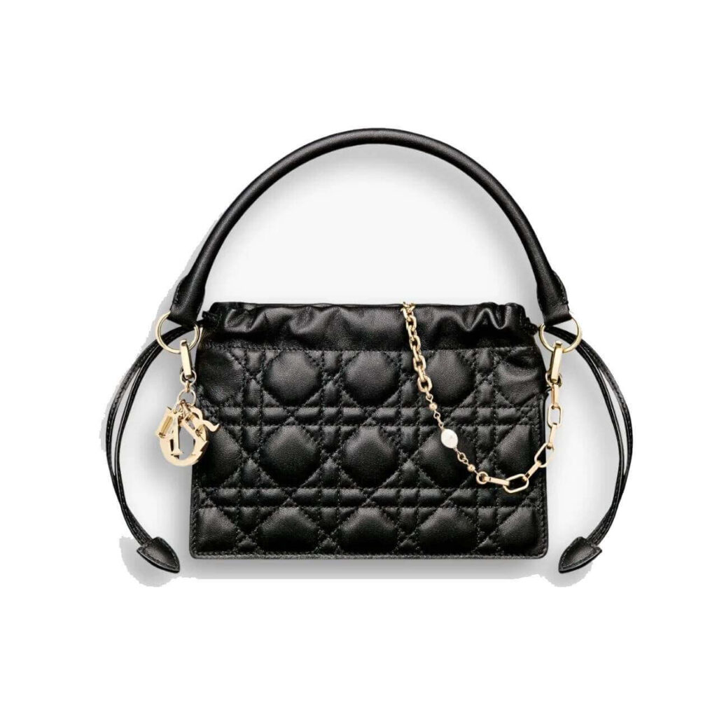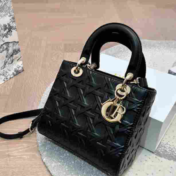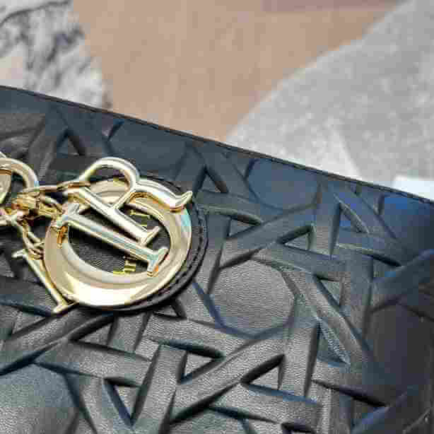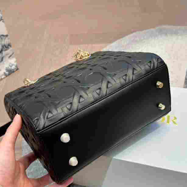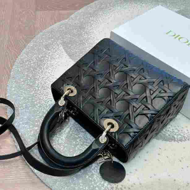 The Dior Medium Lady Dior Bag in Black features the iconic Graphic Cannage calfskin, a modern 3D interpretation of the classic Dior quilting. The structured design is finished with pale gold-tone D.I.O.R. charms, giving the bag its signature look.