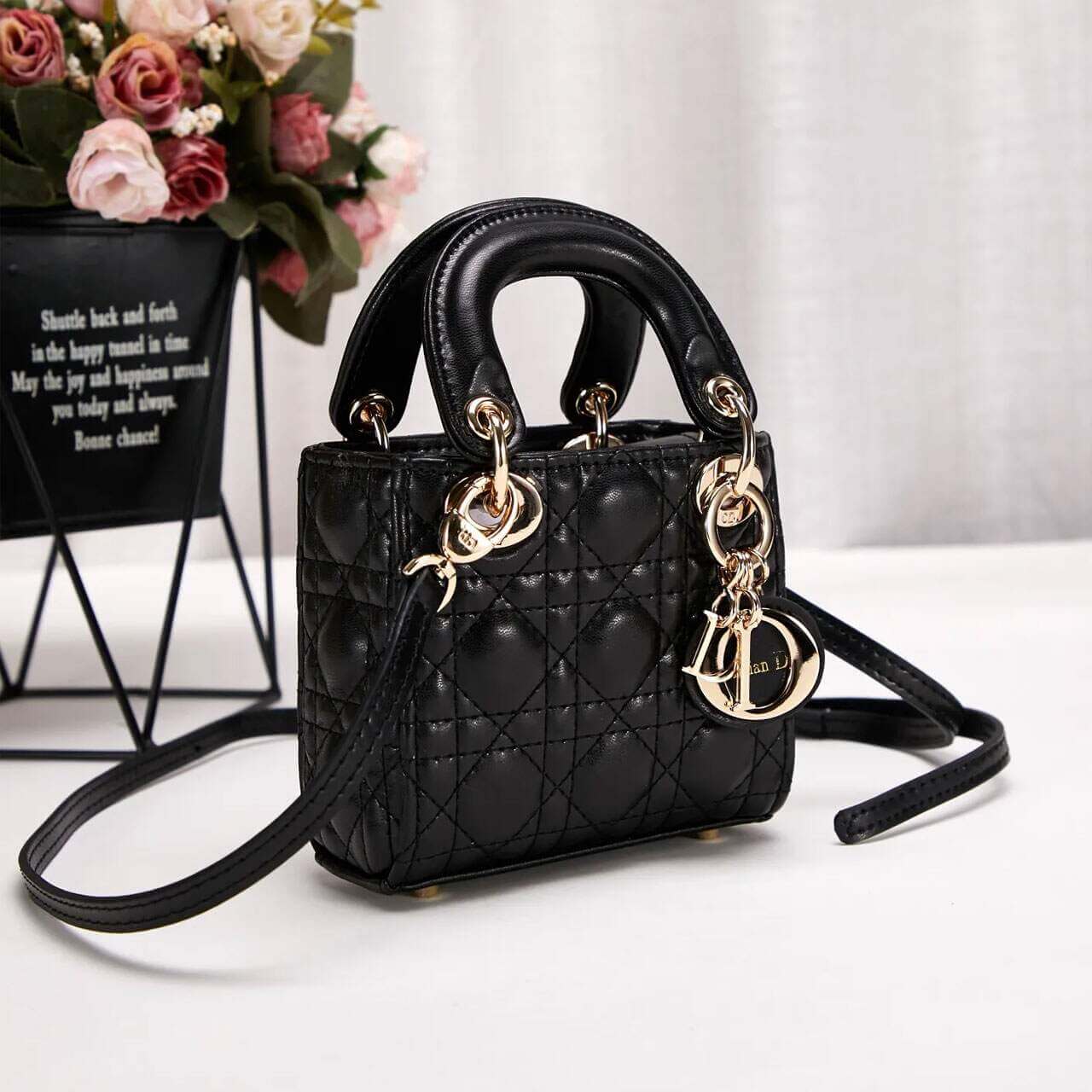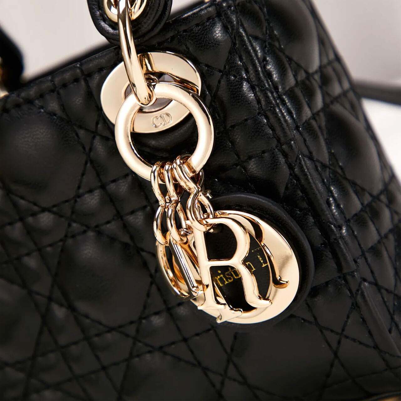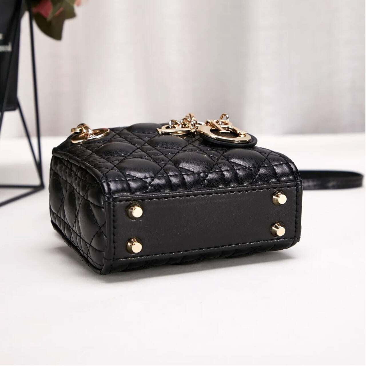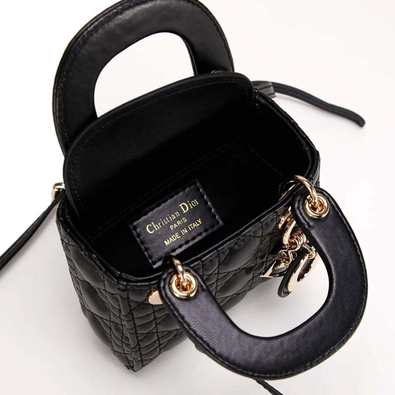 The Dior Lady Dior Micro Bag Black 12cm is a compact version of the classic Lady Dior design. Made from black Cannage lambskin, it features the signature quilted pattern and a D.I.O.R. charm at the front.