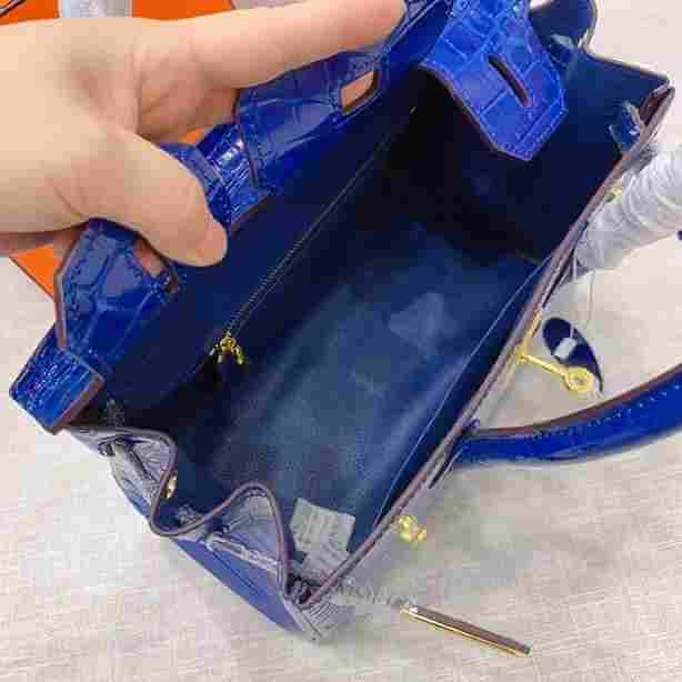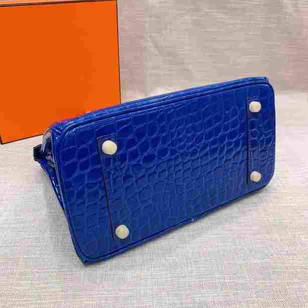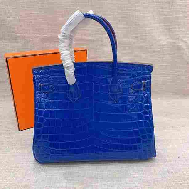 The Hermes Birkin in dark blue crocodile leather is a timeless luxury handbag known for its structured design and elegant style. The deep navy color paired with gold-tone hardware creates a refined look that works for both everyday wear and special occasions.