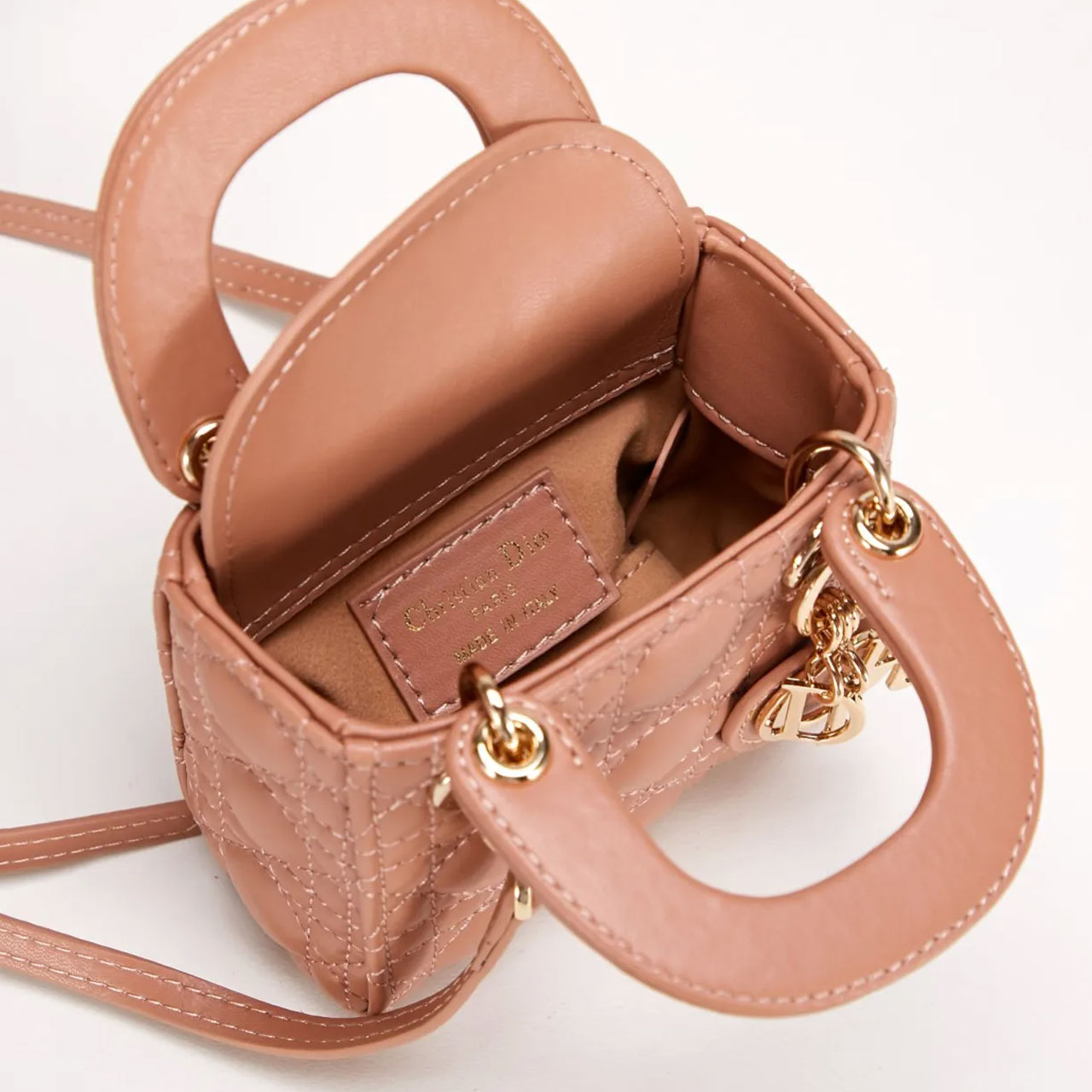 The Lady Dior Micro Bag in Rose des Vents is a small, stylish handbag crafted from soft Cannage lambskin. Its iconic quilting and gold-tone D.I.O.R. charm makes it instantly recognizable.