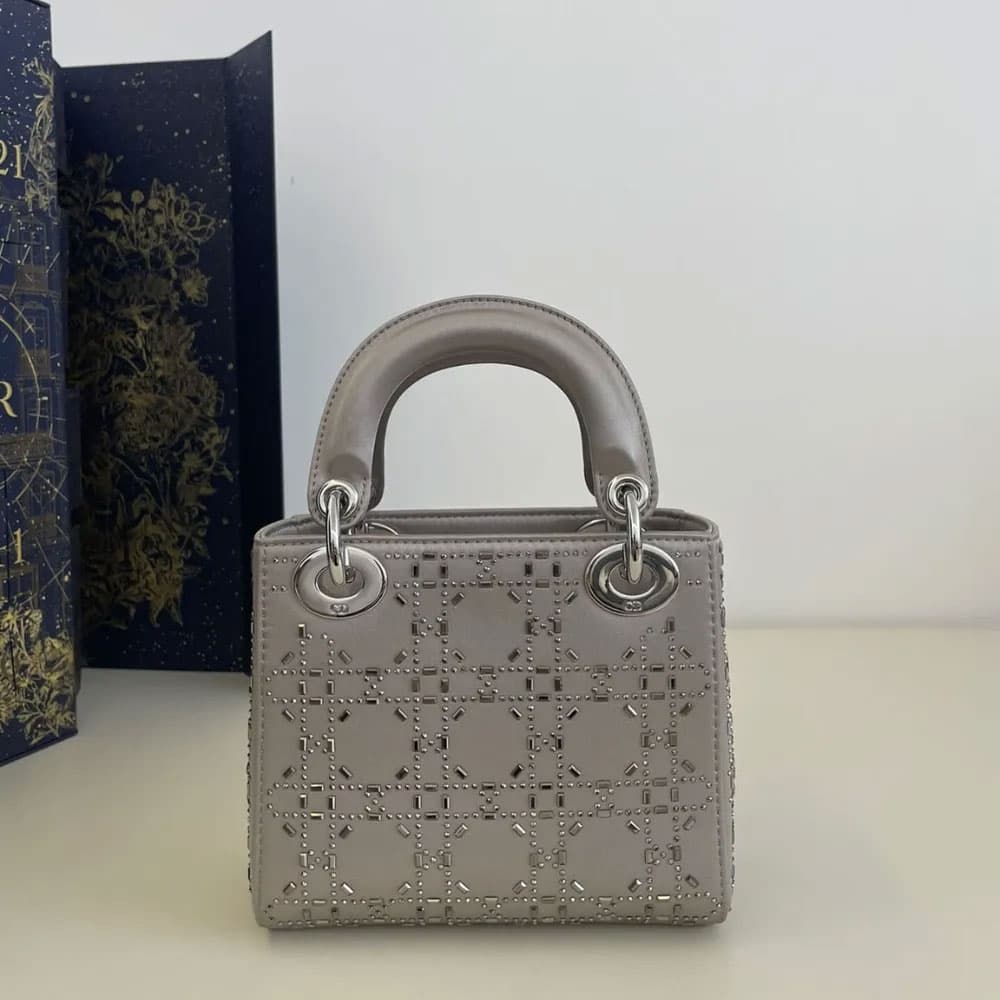 The Dior Mini Lady Dior Bag Strass Satin Gray 17cm M0500PRTC M932 showcases a structured evening silhouette finished in Strass Cannage satin. The surface is covered in strass detailing, creating a refined, light-catching effect.
